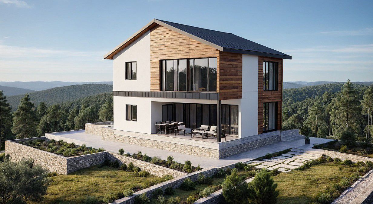 Modern Mimari: Düz çatılı tasarım ve geniş cam yüzeylerle ferah yaşam alanları.